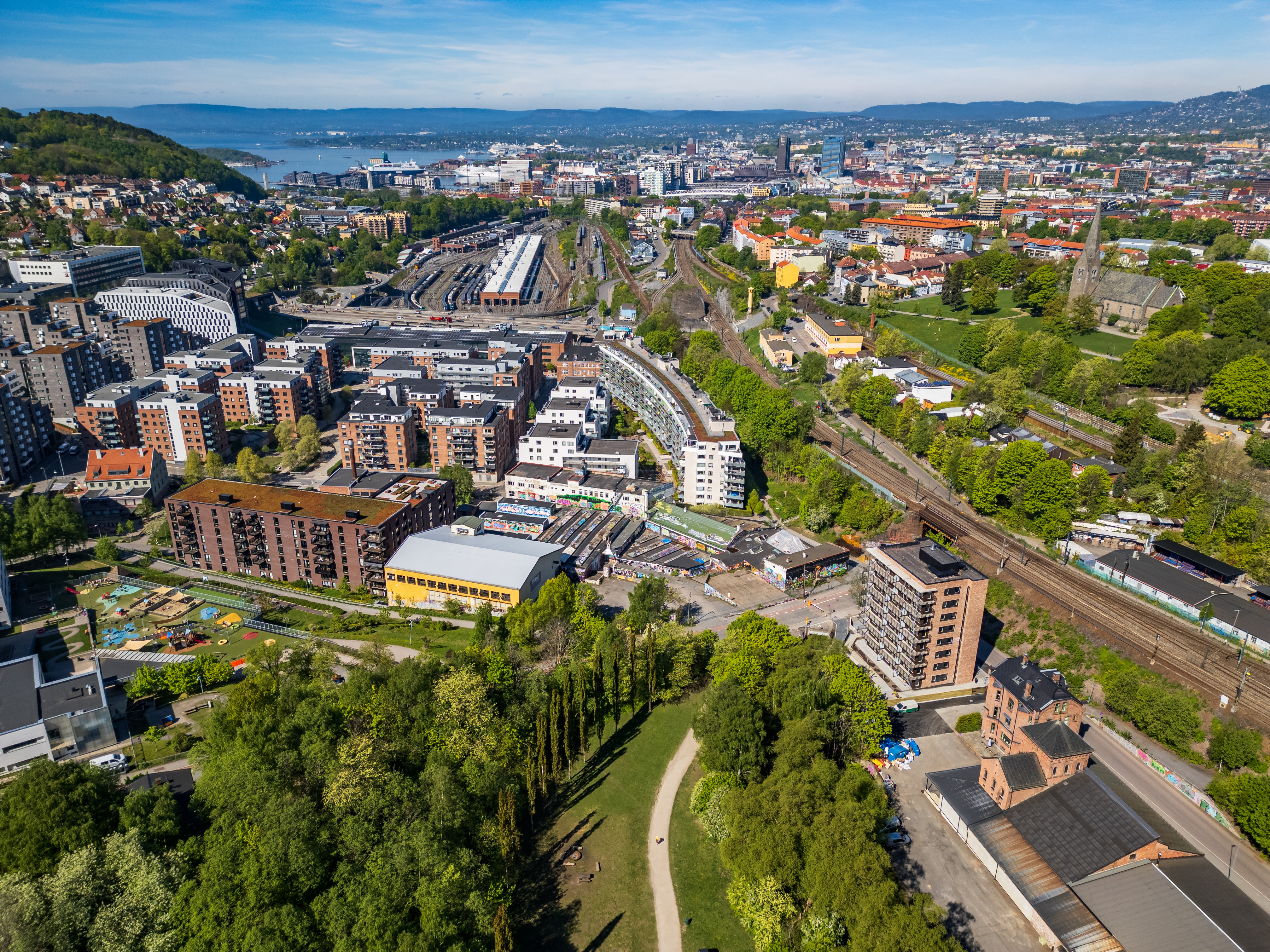 Nærområdet er barnevennlig og rolig med flotte turveier, parker, butikker, kafeer og restauranter. Det er også kort vei til både barnehager, skoler og kollektivtilbud. Nærmeste bussholdeplass er Kværnerbyen som ligger 4 minutter fra leilighetene.