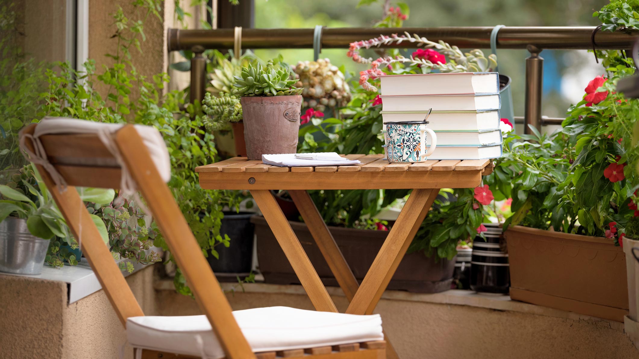Store blomsterkrukker stjeler gulvareal og kompliserer møbleringen av balkongen. Men hvem sier at blomstene må stå på gulvet? Et godt alternativ er å henge dem på veggen eller i ampler fra taket dersom det lar seg gjøre. Det er fullt mulig å få en grønn og frodig uteplass uten å ofre knappe kvadratmeter.