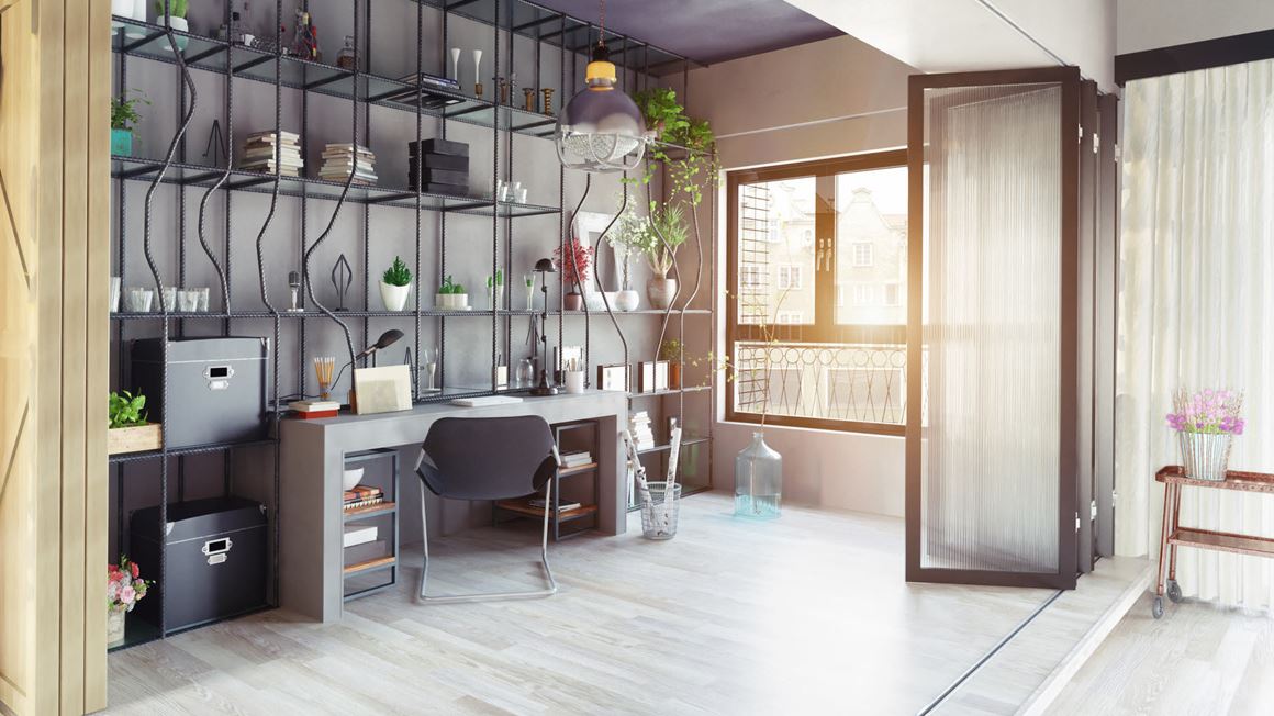 Skillevegger som kan åpnes helt opp er en fin måte å skille kontoret fra resten av rommet uten at det går på bekostning av plassen.